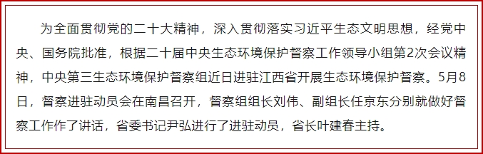 劉偉強(qiáng)調(diào),做好中央生態(tài)環(huán)境保護(hù)督察,要將貫徹落實(shí)習(xí)近平生態(tài)文明思想作為重大政治任務(wù),把習(xí)近平總書記重要指示批示落實(shí)情況作為重中之重,堅(jiān)持以人民為中心,堅(jiān)持服務(wù)大局,堅(jiān)持系統(tǒng)觀念,堅(jiān)持問(wèn)題導(dǎo)向和嚴(yán)的基調(diào),堅(jiān)持精準(zhǔn)科學(xué)依法,統(tǒng)籌經(jīng)濟(jì)發(fā)展、民生保障和生態(tài)環(huán)境保護(hù)。督察既關(guān)注長(zhǎng)江經(jīng)濟(jì)帶流域性整體性共性問(wèn)題,也注重結(jié)合江西省經(jīng)濟(jì)社會(huì)發(fā)展、自然資源稟賦、生態(tài)安全定位,找準(zhǔn)江西省突出問(wèn)題。重點(diǎn)關(guān)注習(xí)近平生態(tài)文明思想和習(xí)近平總書記重要指示批示貫徹落實(shí)情況;黨中央、國(guó)務(wù)院有關(guān)重大決策部署和長(zhǎng)江保護(hù)法等法律法規(guī)落實(shí)情況;綠色低碳發(fā)展情況,積極穩(wěn)妥推進(jìn)碳達(dá)峰碳中和,堅(jiān)決遏制“兩高一低”項(xiàng)目盲目上馬情況;污染防治攻堅(jiān)戰(zhàn)進(jìn)展情況;大氣污染防治中的突出問(wèn)題;違法違規(guī)侵占自然保護(hù)地、突破生態(tài)保護(hù)紅線開發(fā)建設(shè)、破壞岸線,以及耕地生態(tài)破壞和長(zhǎng)江十年禁漁落實(shí)不到位等問(wèn)題;環(huán)境基礎(chǔ)設(shè)施建設(shè)運(yùn)行、農(nóng)業(yè)面源污染防治、固體廢物尤其是建筑垃圾處理處置情況;重要湖泊保護(hù)治理和重要支流生態(tài)環(huán)境保護(hù)情況;督察和生態(tài)環(huán)境警示片發(fā)現(xiàn)問(wèn)題整改情況;人民群眾反映突出的生態(tài)環(huán)境問(wèn)題;生態(tài)環(huán)境保護(hù)“黨政同責(zé)”“一崗雙責(zé)”落實(shí)情況等。