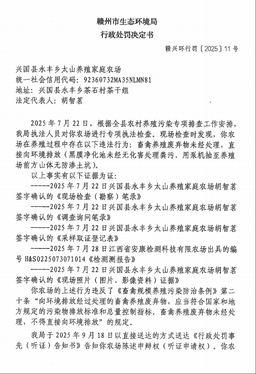 興國縣永豐鄉(xiāng)太山養(yǎng)殖家庭農(nóng)場行政處罰決定書公示(贛興環(huán)行罰【2025】11號(hào))