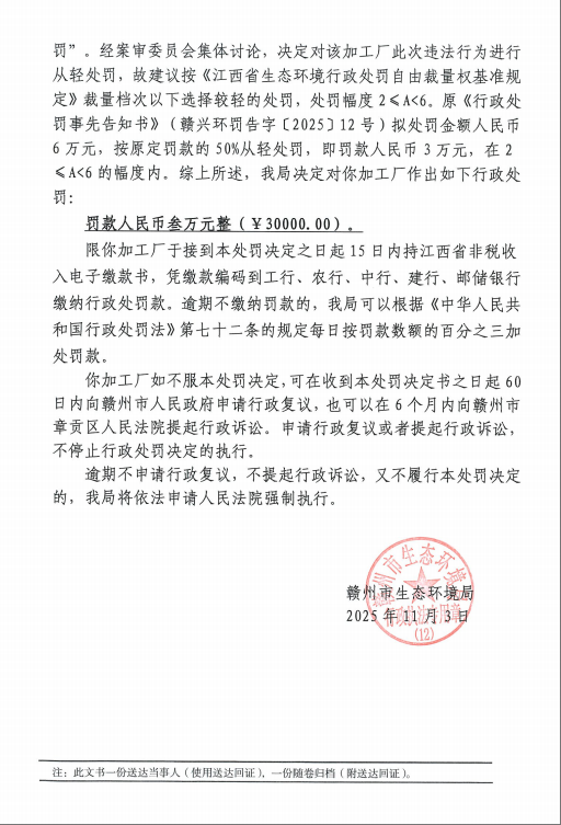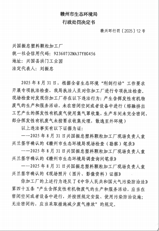興國振忠塑料顆粒加工廠行政處罰決定書公示(贛興環行罰【2025】12號)
