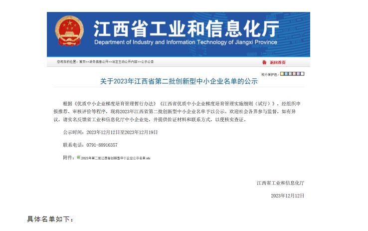 根據工信部《優質中小企業梯度培育管理暫行辦法》《江西省優質中小企業梯度培育管理實施細則(試行)》,經我縣組織申報推薦、省市審核評價等程序,確定了2023年江西省第二批創新型中小企業公示名單,我縣共有10家企業入選。