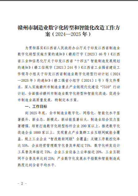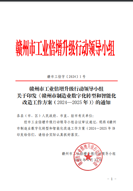 關于印發《贛州市制造業數字化轉型和智能化改造工作方案(2024—2025年)》的通知