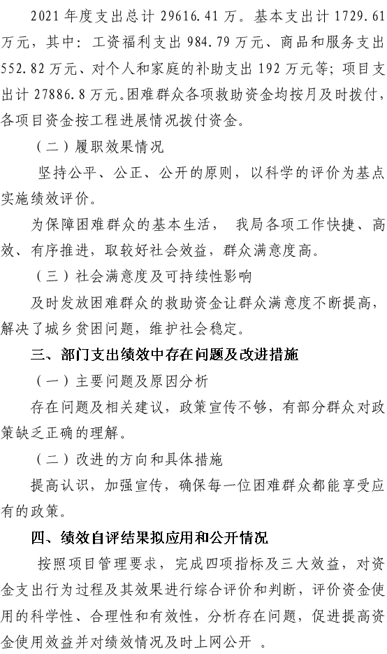 組織開展部門整體支出績效評價,涉及一般公共預算支出28871萬元,政府性基金預算支出0萬元。從評價情況來看,各項目資金發(fā)放及時,切實解決了困難群眾的基本生活。