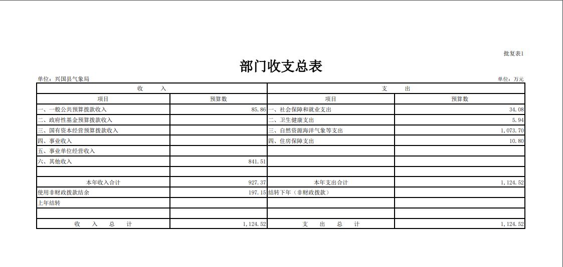2023年興國縣氣象局部門總收入1,124.52萬元,其中:本年收入927.37萬元,上年結轉/萬元,使用非財政撥款結余197.15萬元。