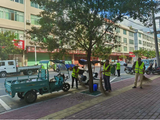 活動中,一群身著亮黃色背心的環衛工人成為了最亮眼的風景線。他們手持掃帚、簸箕,在城鎮的大街小巷忙碌著。有的仔細清掃人行道上的落葉、紙屑,不放過任何一個衛生死角;有的駕駛著環衛三輪車,及時轉運收集的垃圾,確保路面始終保持潔凈。同時,工作人員們認真清理著墻面的小廣告,規整亂停的車輛,讓街道立面煥然一新,秩序井然。紅磚鋪就的人行道上,他們揮動工具的身影與兩旁的綠樹、整潔的商鋪相映成趣,構成了一幅生動的勞動畫卷。