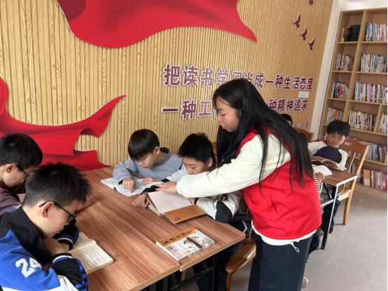 活動現場,志愿者熱情地為孩子們提供幫助與引導。孩子們圍坐在桌旁,手中捧著心儀的書籍,沉浸在知識的海洋里。墻上 “把讀書學習當成一種生活態度、一種精神追求” 的標語,更是營造出濃厚的閱讀氛圍。
