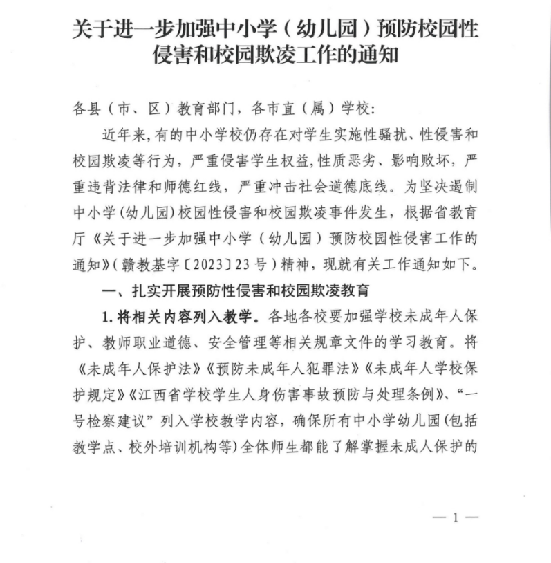 【有效】【規范性文件】關于進一步加強中小學(幼兒園)預防校園性侵害和校園欺凌工作的通知