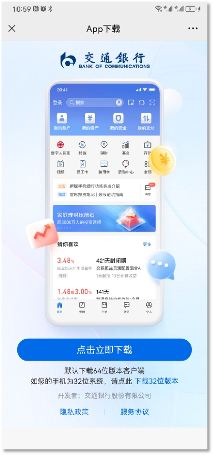 下載途徑一:在應用市場中搜索“交通銀行”手機銀行APP進行下載并注冊。
