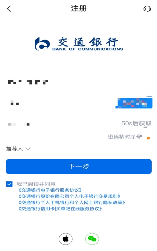 第二步:輸入本人手機號碼、圖形驗證碼和短信驗證碼,并在閱讀同意各項協議后完成點擊“下一步”。