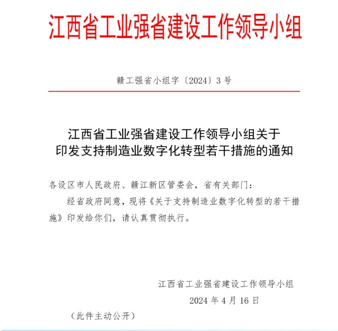 為貫徹落實《江西省制造業數字化轉型實施方案》《江西省制造業數字化轉型行動計劃(2024-2025年)》,聚焦省制造業重點產業鏈現代化建設“1269”行動計劃,通過省級工業發展專項資金,引導和支持制造業數字化轉型,推動全省制造業高端化、智能化、綠色化發展,提出如下措施: