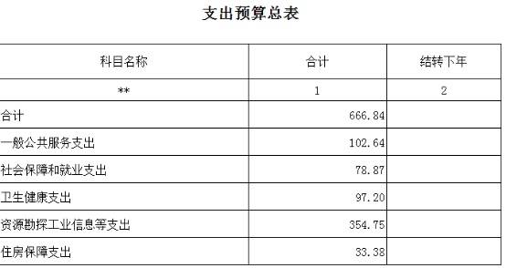 按支出功能科目劃分:一般公共服務支出102.64萬元,教育支出0萬元,社會保障和就業支出78.87萬元,衛生健康支出97.2萬元,住房保障支出33.38萬元,資源勘探工業信息等支出354.75萬元。