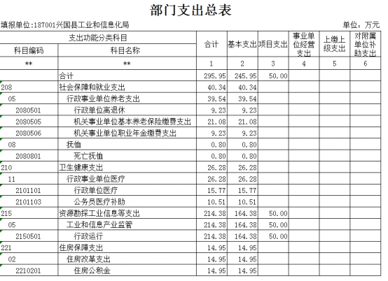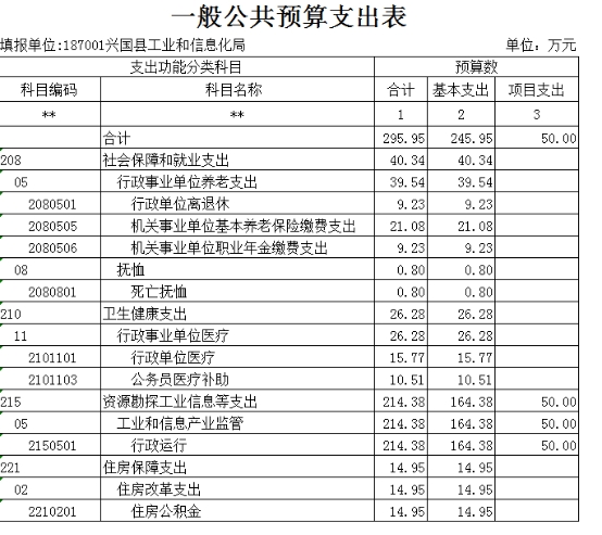 2021年興國縣工業和信息化局財政撥款支出預算總額為財政撥款支出預算總額666.84萬元,較上年預算安排增加14.5萬元,原因主要是公用經費由2020年的人均5500元增至2021年的人均6000元,每人增加500元 。