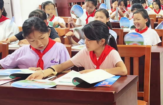 多元載體,法治種子浸潤校園。活動創新采用“宣講+實物”雙軌普法模式。授課結束后,工作人員向學生發放圖文并茂的《圖說民法典》、平安興國宣傳手冊及定制法治宣傳扇,該書以彩色插圖、案例故事生動解讀民事權利、校園侵權等條款,適配中低年級認知水平;手冊匯集反詐核心條款及自護指南,普法扇則印有“滿意度雙提升”等內容,讓學生在日常生活中抬眼可見、隨手可學。現場互動環節,學生們紛紛打開宣傳冊朗讀法律口訣,法治意識如清風相伴。