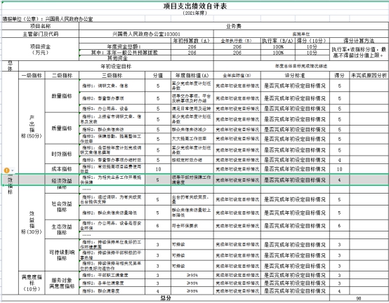 業(yè)務(wù)費(fèi)項(xiàng)目績效自評(píng)綜述:根據(jù)年初設(shè)定的績效目標(biāo),業(yè)務(wù) 費(fèi)項(xiàng)目績效自評(píng)得分為98分。項(xiàng)目全年預(yù)算數(shù)為206萬元,執(zhí)行數(shù)為206萬元,完成預(yù)算的100%。主要產(chǎn)出和效果:一是辦公室調(diào)研文章、上報(bào)省市信息數(shù)量和質(zhì)量年度完成情況較好,被省評(píng)為信息工作先進(jìn)單位,2名干部被評(píng)為信息工作先進(jìn)個(gè)人;二是政府督查督辦事項(xiàng)的辦結(jié)效率明顯提高,問政江西、問政贛州平臺(tái)反饋的問題都能及時(shí)回復(fù),縣滿意度較高。三是干部職工的工作積極性不斷提高、辦公環(huán)境進(jìn)一步優(yōu)化。發(fā)現(xiàn)的問題及原因:一是部門業(yè)務(wù)人員對績效評(píng)價(jià)工作的開展還不太精通。下一步改進(jìn)措施:一是單位部門督促相關(guān)人員加強(qiáng)自身業(yè)務(wù)學(xué)習(xí),工作上要強(qiáng)化溝通對接,默契配合,共同把績效評(píng)價(jià)工作做好;二是希望有關(guān)部門能對單位加強(qiáng)預(yù)算績效評(píng)價(jià)方面的業(yè)務(wù)培訓(xùn)與指導(dǎo)。