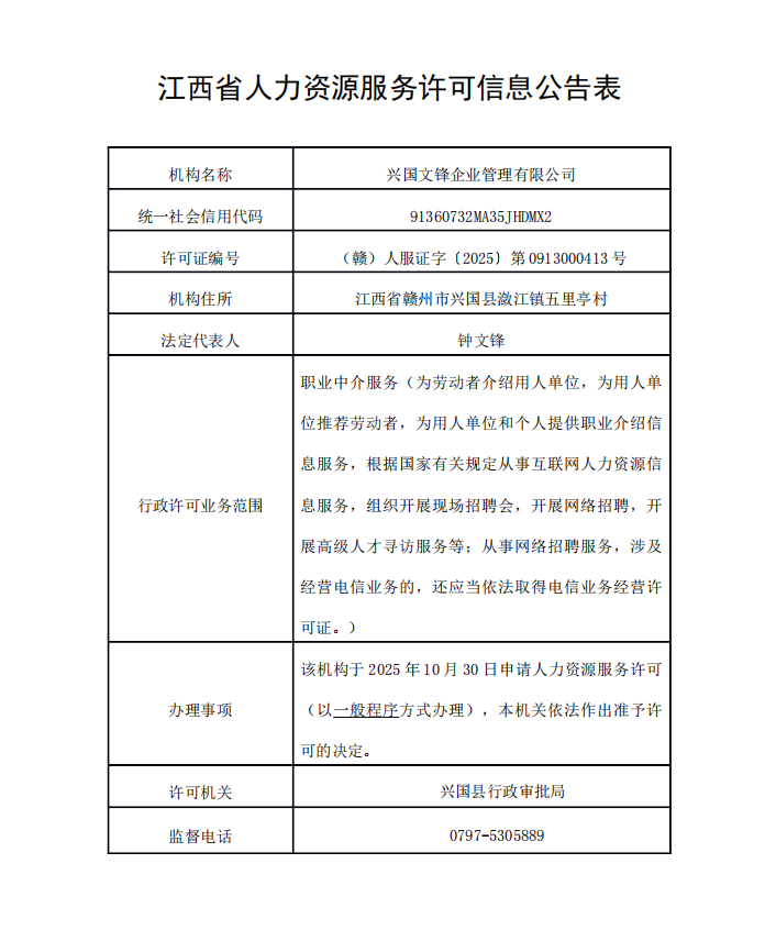 江西省人力資源服務許可信息公告表(興國文鋒企業管理有限公司)