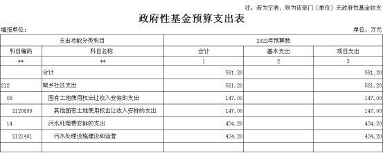 2022年政府性基金預算支出總額為581.2萬元;較上年預算安排增加13.68萬元,增加2.41%。其中: