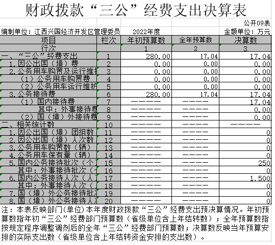 6.“三公”經費支出:指用財政撥款安排的因公出國(境)費、公務用車購置及運行維護費和公務接待費。其中,因公出國(境)費反映單位公務出國(境)的國際旅費、國外城市間交通費、住宿費、伙食費、培訓費、公雜費等支出;公務用車購置及運行維護費反映單位公務用車車輛購置支出(含車輛購置稅、牌照費),按規定保留的公務用車燃料費、維修費、過橋過路費、保險費、安全獎勵費用等支出;公務接待費反映單位按規定開支的各類公務接待(含外賓接待)支出。
