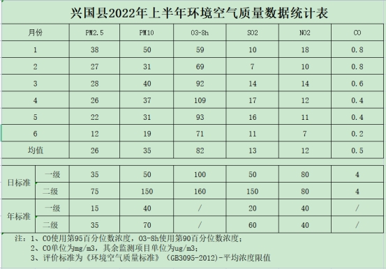 2022年上半年,興國縣城區環境空氣質量為二級(詳見統計表),城區環境空氣質量優良率98.9%。