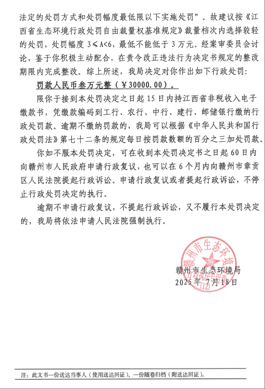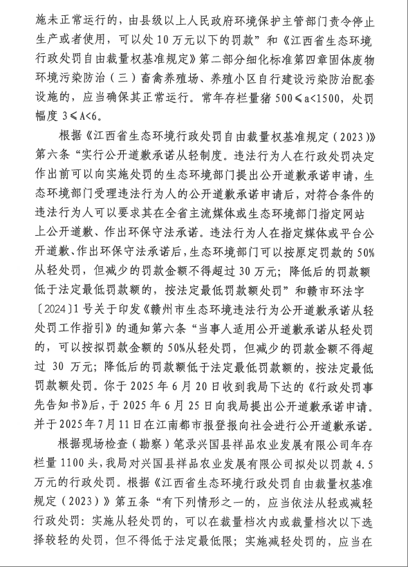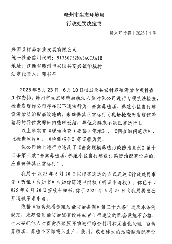 興國縣祥品農業發展有限公司行政處罰決定書公示(贛興環行罰〔2025〕4號)