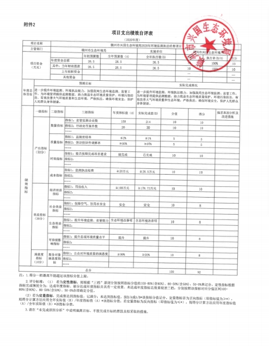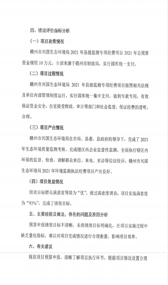 項目績效自評總體綜述:根據要求,我部門對2021年度環境監測執法工作經費等3個項目支出開展了績效自評,涉及金額186萬元.從自評結果來看,績效目標群眾滿意度等級為“優”,通過滿意度調查,項目實施滿意度為“93%”,完成了績效目標。