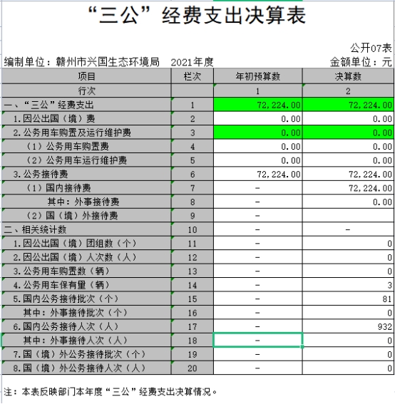 (二)公務接待費支出年初預算數為7.2萬元,決算數為7.2 萬元,完成預算的 100%,決算數較 2020 年減少2.7萬元,下降27.3 %,主要原因是公務接待控制較好。全年國內公務接待81 批,累計接待932人次,主要為:江西省生態環境廳對新冠肺炎疫情下的生態環境監管進行幫扶、調研和督導,執法大練兵中異地交叉執法活動開展,江西省生態環境廳專家評審活動,鄉鎮工作對接等。