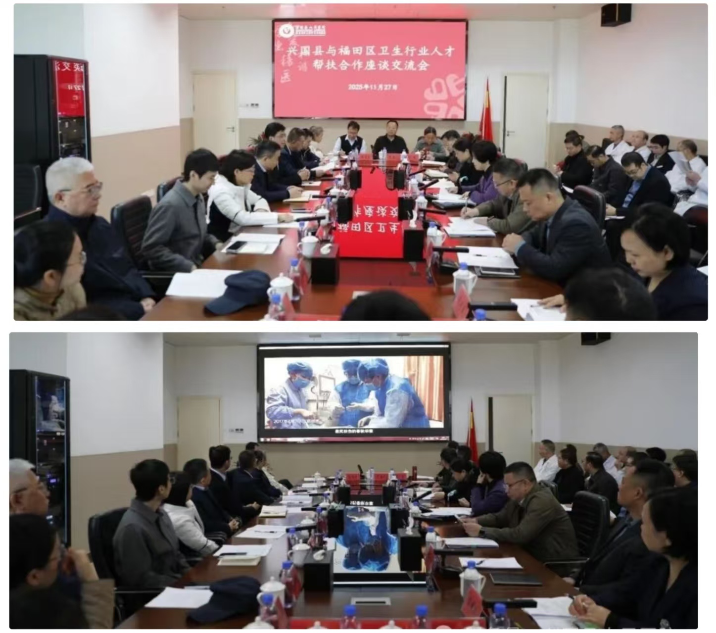 11月27 日,福田區衛生行業人才代表團來興參訪交流,并召開雙方衛生行業人才合作座談交流會。福田區第二人民醫院副院長萬超、福田區婦幼保健院副院長林松青、福田區第三人民醫院副院長張雪姣、福田區肛腸醫院副院長郭文濤、福田區人力資源局副科長蔡宇涵,縣衛健委黨委書記、主任王金陵,縣衛健委副主任鐘輝,縣人民醫院黨委副書記黃向萍,黨委委員、副院長黃永生,縣中醫院黨總支委員朱福彬,縣婦幼保健院副院長肖艷春出席會議。兩地衛生行業人才代表參加會議。