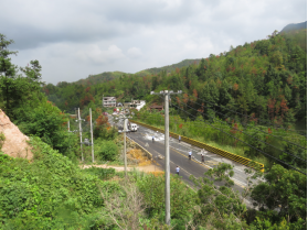 1.道路、環境情況。事故現場位于國道319線904km+900m(江西省贛州市興國縣東村鄉壩子村)彎道由東往西下坡路段,現場道路呈東西走向,東往興國縣樟木鄉,西往興國縣江背鎮,南北為臨崖,屬二級公路,彎道、下坡,瀝青路面,雙向兩車道,中間施劃有黃色實線,道路兩側設有水泥防護墩,路寬7.55米,兩側路肩寬分別為左側2.3米,右側1.9米,該路段限速40km/h 。