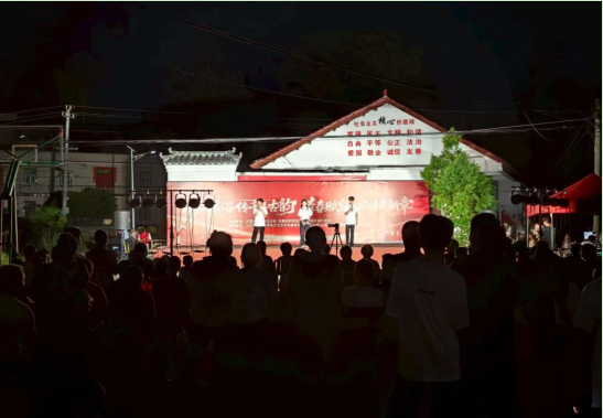 活動最后一天晚上,在文明實踐廣場上舉行了熱鬧的文藝匯演。隊員們自編自導節目,村民們早早圍坐觀看。孩子們的合唱清澈嘹亮,老人們頻頻點頭。活動尾聲,全體隊員與村民共同唱起《沒有共產黨就沒有新中國》,歌聲中滿是不舍與期盼。
