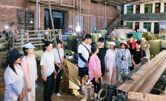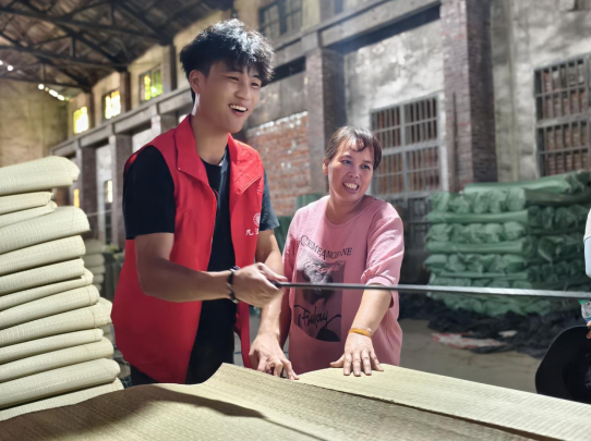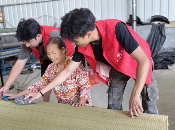 收割完后,來到江背鎮草席編織廠,在負責人帶領下,體驗草席制作從選草、泡草、編織到烘干、調次品、平光、裁剪等眾多工序,盡管天氣炎熱,但隊員們依然熱情高漲、干勁十足,通過田間工廠勞動,更深刻體會到耕作的艱辛與收獲的快樂。