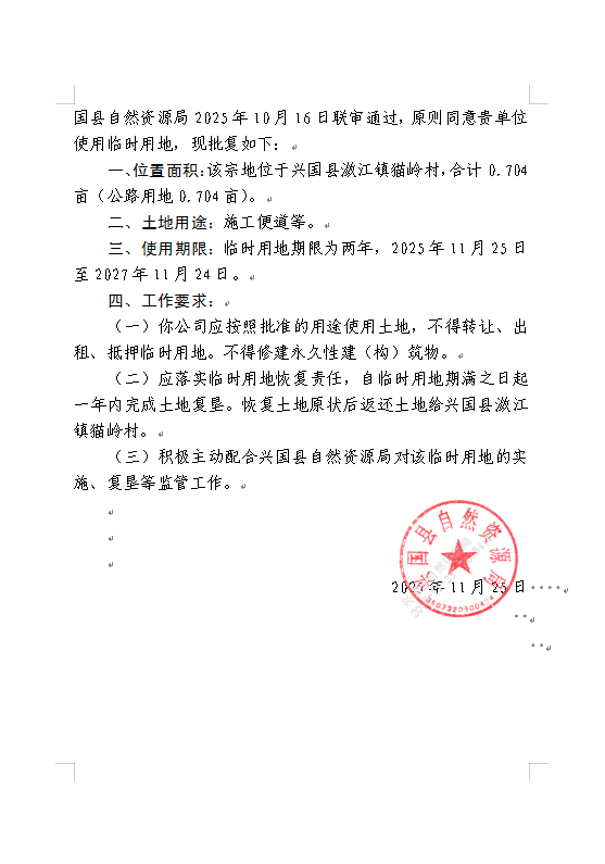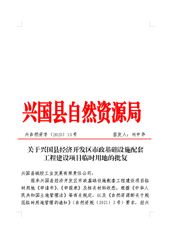 關于興國縣經(jīng)濟開發(fā)區(qū)市政基礎設施配套工程建設項目臨時用地的批復