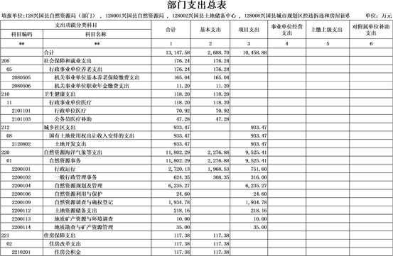 2021年興國縣自然資源局支出預算總額為13147.58萬元,較上年減少1331.73萬元,原因是部分項目資金減少。。