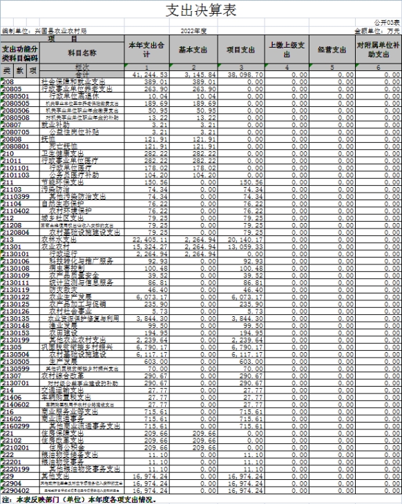 本單位2022年度收入總計41244.53萬元,其中年初結(jié)轉(zhuǎn)和結(jié)余 0 萬元,較2021年增加(減少)13112.89 萬元,下降100%;本年收入合計41244.53萬元,較2021年減少1734.23 萬元,下降4 %,主要原因是:2022年較上一年減少了農(nóng)林水相關(guān)項目支出。