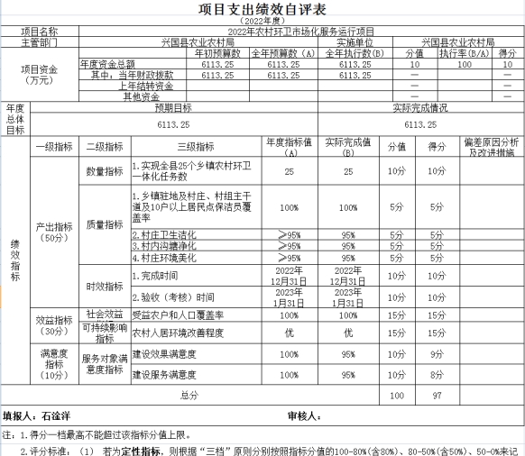 在效益指標(biāo)方面,縣鄉(xiāng)出臺的“五定包干”村莊環(huán)境長效管護(hù)辦法,實用管用且長期有效運行,農(nóng)村人居環(huán)境得到較大改善,自評分15分;受益農(nóng)戶和人口覆蓋率達(dá)100%,自評分15分。