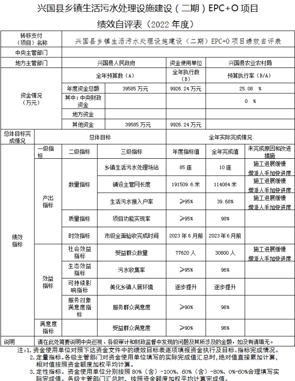組織對農(nóng)村環(huán)衛(wèi)一體化項目、興國縣鄉(xiāng)鎮(zhèn)生活污水處理設(shè)施建設(shè)(二期)EPC+O項目、興國縣高標(biāo)準(zhǔn)農(nóng)田等3個項目開展了部門評價,涉及一般公共預(yù)算支出16397.1萬元,政府性基金預(yù)算支出17053.49萬元,國有資本預(yù)算支出 0萬元。從評價情況來看,農(nóng)村環(huán)衛(wèi)一體化項目根據(jù)年初設(shè)定的績效目標(biāo),績效自評得分為97分。項目全年預(yù)算數(shù)為6113.25萬元,執(zhí)行數(shù)為6113.25萬元,完成預(yù)算的100 %,在滿意度指標(biāo)方面,建設(shè)效果滿意度95%;高標(biāo)準(zhǔn)農(nóng)田建設(shè)項目從產(chǎn)出指標(biāo)、效益指標(biāo)、滿意度指標(biāo)分析,年度指標(biāo)值6萬畝。通過項目計劃階段上圖入庫顯示,實際建成面積為6.3萬畝;新增高效節(jié)水灌溉面積,年度指標(biāo)值6000畝,根據(jù)設(shè)計方案,實施面積為6000畝;糧食綜合生產(chǎn)能力預(yù)計畝均新增糧食產(chǎn)量100斤以上,糧食綜合生產(chǎn)能力明顯提升。田間道路通達(dá)度,項目建成以后,平原地區(qū)道路通達(dá)度100%,山地、丘陵地區(qū)道路通達(dá)度90%,服務(wù)對象受益群眾滿意度,通過走訪受益群眾,調(diào)查統(tǒng)計結(jié)果為滿意度為95%。興國縣鄉(xiāng)鎮(zhèn)生活污水處理設(shè)施建設(shè)(二期)EPC+O項目,新建生活污水處理場站,總設(shè)計建設(shè)85座。項目本階段實際建成10座。新鋪設(shè)污水主管網(wǎng)總設(shè)計建設(shè)191509.6米。項目本階段實際完成114084米。生活污水接入戶率總計劃接戶率達(dá)95%以上,項目本階段實際接戶率39.68%。本階段項目完成后,受益群眾數(shù)量達(dá)到3.76萬人,污水收集率達(dá)到95%以上。因涉及鄉(xiāng)鎮(zhèn)多、點多面廣,存在處理場站征地困難,群眾理解、接受不一;施工過程中存在停工、阻工等現(xiàn)象,矛盾糾紛難以協(xié)調(diào),導(dǎo)致施工進(jìn)度以及資金撥付進(jìn)度緩慢。