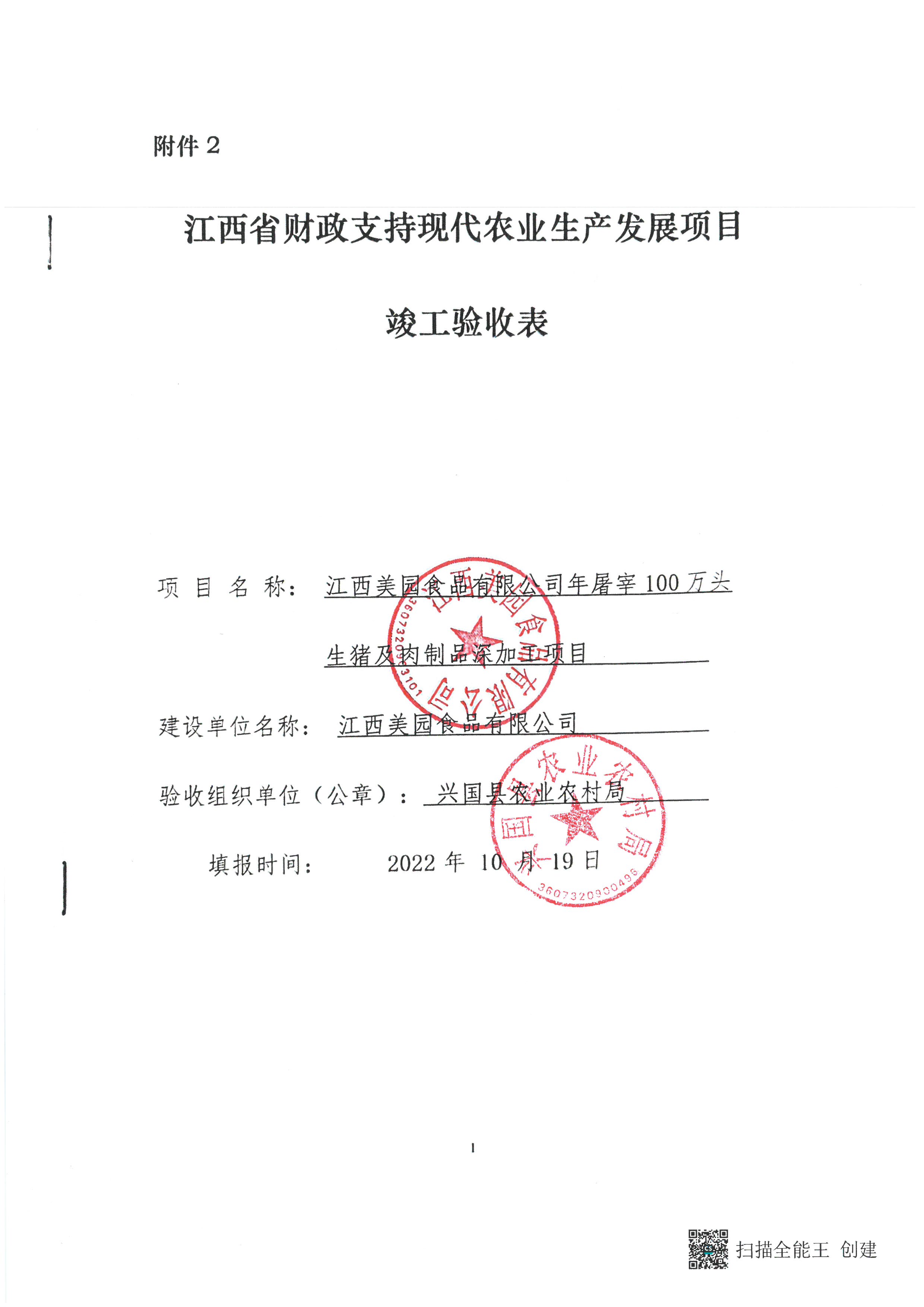 江西美園食品有限公司年屠宰100萬頭生豬及肉制品深加工項(xiàng)目竣工驗(yàn)收情況