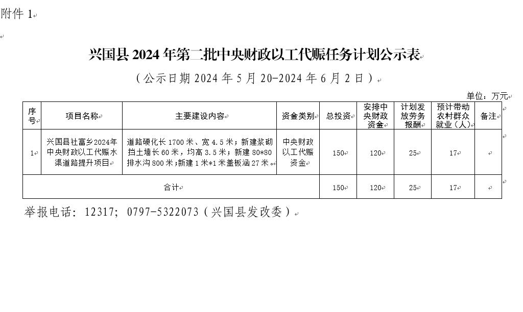 興國縣2024年第二批中央財(cái)政以工代賑任務(wù)計(jì)劃公示表