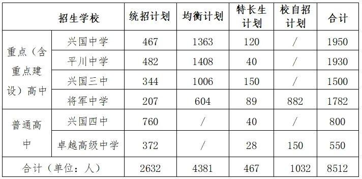 (2)第一批次錄取:重點(含重點建設(shè))高中統(tǒng)招錄取。按考生統(tǒng)招1志愿錄取(興國中學(xué)、平川中學(xué)、興國三中、將軍中學(xué))。