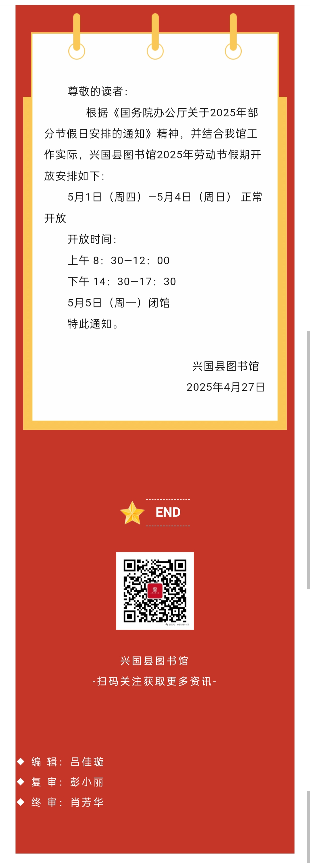 興國縣圖書館2025年勞動節(jié)假期開放安排