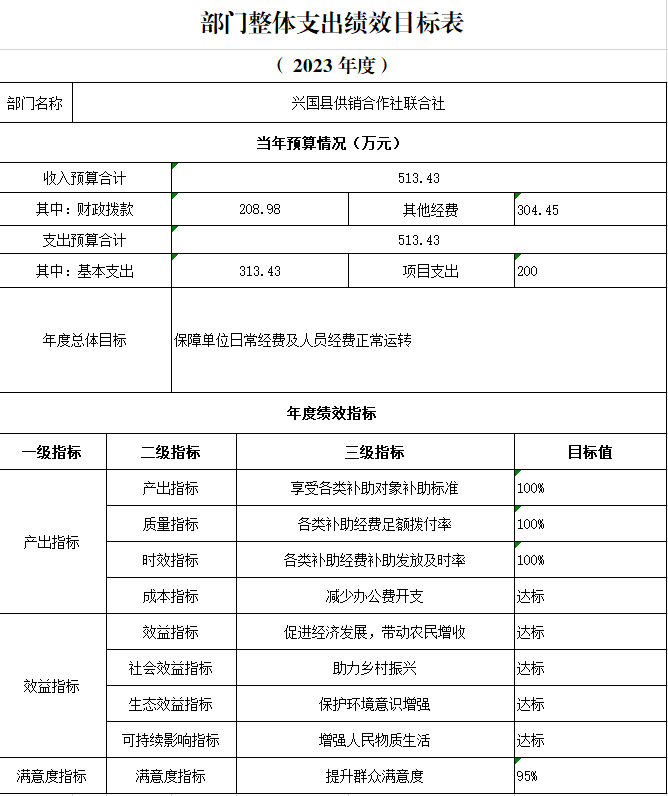 6.年度績效目標:保障供銷社機關日常工作運行運轉,建立健全供銷合作社為農服務網絡,提升供銷合作社為農服務功能