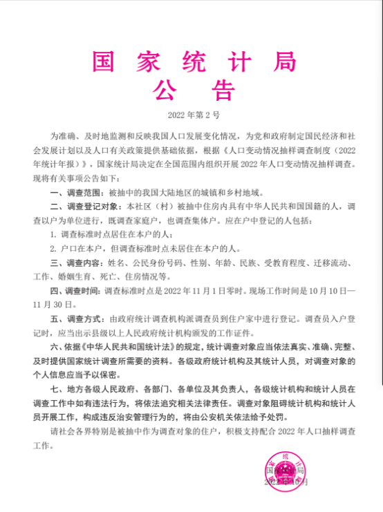 為準確、及時地掌握全國和各省(自治區、直轄市)人口發展變化情況,加強人口監測和形勢研判,為國家和省級人民政府制定國民經濟和社會發展計劃,調整完善有關政策,促進人口長期均衡發展,提供可靠的人口數據,根據國辦發〔1992〕57號文件的要求,進行2022年人口變動情況抽樣調查。