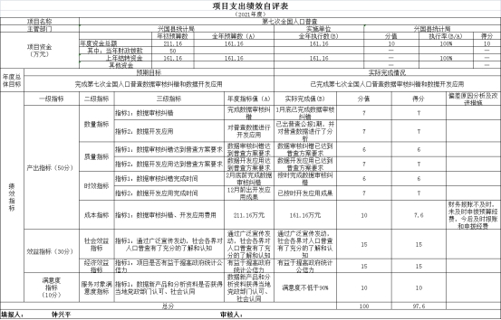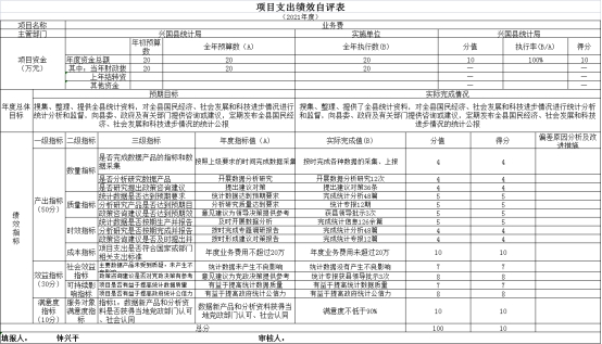 2021年度部門申報(bào)的第七次全國(guó)人口普查、業(yè)務(wù)費(fèi)等5個(gè)項(xiàng)目績(jī)效目標(biāo)為全面完成本縣的統(tǒng)計(jì)和國(guó)民經(jīng)濟(jì)核算工作;組織宣傳、貫徹統(tǒng)計(jì)法律法規(guī),監(jiān)督檢查統(tǒng)計(jì)法律法規(guī)的實(shí)施。在縣政府的領(lǐng)導(dǎo)下,組織完成國(guó)務(wù)院統(tǒng)一布置的第七次全國(guó)人口普查。收集、匯總、整理、提供全縣性基本統(tǒng)計(jì)資料;對(duì)國(guó)民經(jīng)濟(jì)、社會(huì)發(fā)展和科技進(jìn)步進(jìn)行統(tǒng)計(jì)分析、統(tǒng)計(jì)預(yù)測(cè)和統(tǒng)計(jì)監(jiān)督,向縣委、縣政府及有關(guān)部門提供決策咨詢建議。統(tǒng)一核定、管理、公布、出版全縣性統(tǒng)計(jì)資料,定期發(fā)布全縣國(guó)民經(jīng)濟(jì)和社會(huì)發(fā)展情況的統(tǒng)計(jì)公報(bào)。本部門高度重視項(xiàng)目支出績(jī)效自評(píng)工作,成立了項(xiàng)目支出績(jī)效自評(píng)工作領(lǐng)導(dǎo)小組,專題召開會(huì)議進(jìn)行了安排部署,提出績(jī)效自評(píng)工作總體要求,對(duì)評(píng)價(jià)依據(jù),評(píng)價(jià)目的,考評(píng)對(duì)象,方法步驟,工作進(jìn)度做出具體規(guī)定,將責(zé)任落實(shí)到具體個(gè)人,將工作落實(shí)到具體項(xiàng)目,確保了自評(píng)工作組織到位,責(zé)任到位,項(xiàng)目到位。從評(píng)價(jià)情況來以上項(xiàng)目支出績(jī)效管理情況較為理想,達(dá)到了年初設(shè)定的各項(xiàng)績(jī)效目標(biāo),圓滿完成了確定的各項(xiàng)目標(biāo)任務(wù)。項(xiàng)目自評(píng)表如下: