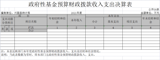 納入本套單位決算匯編范圍的單位共 1 個,包括:興國縣統計局機關。興國縣統計局機關有下設單位1個興國統計普查中心(非獨立核算),為統計局內設機構。興國縣統計局總編制21人(含統計普查中心)其中:行政編制8人、事業編制13人。