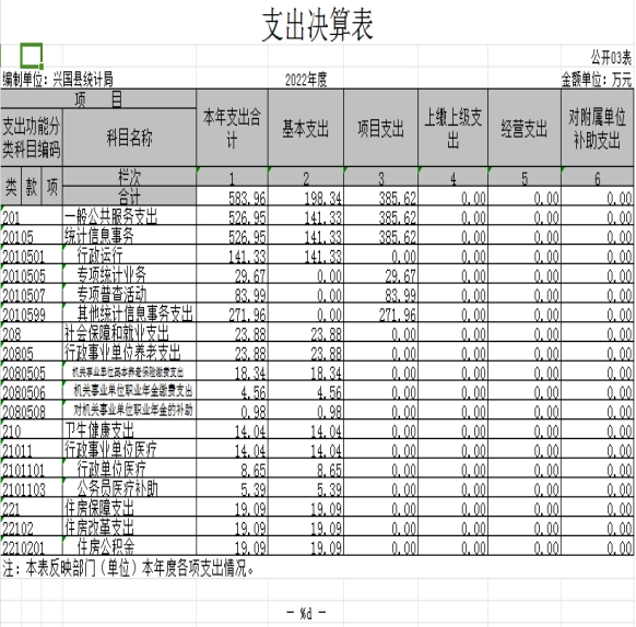 六、項(xiàng)目支出:指在基本支出之外為完成特定的行政任務(wù)或事業(yè)發(fā)展目標(biāo)所發(fā)生的支出。 我單位主要包括:第七次全國人口普查經(jīng)費(fèi)、年鑒印刷經(jīng)費(fèi)、企業(yè)一套表經(jīng)費(fèi)、聯(lián)網(wǎng)直報(bào)、業(yè)務(wù)費(fèi)。