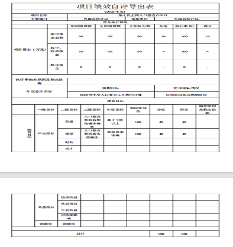 組織對“第七次全國人口普查工作經(jīng)費(fèi)(2021)”等1個項(xiàng)目開展了部門評價(jià),涉及一般公共預(yù)算支出50萬元,政府性基金預(yù)算支出0萬元,國有資本預(yù)算支出0萬元。從評價(jià)情況來看,興國縣第七次全國人口普查(2021)項(xiàng)目按照年度設(shè)定基本完成;項(xiàng)目實(shí)行了項(xiàng)目法人責(zé)任制、政府采購實(shí)行招投標(biāo)制、合同管理制,符合國家規(guī)定和程序要求,手續(xù)齊備。項(xiàng)目財(cái)務(wù)管理基本規(guī)范;支出控制基本合理;檔案資料基本齊全,整理基本規(guī)范;項(xiàng)目已產(chǎn)生了一定的社會及可持續(xù)影響效益,黨政部門和社會各界群眾反映滿意。經(jīng)評價(jià)組統(tǒng)一分析評價(jià),最終評分結(jié)果為100分,績效評價(jià)等級為優(yōu)。