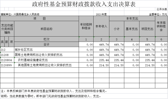 縣財政局年初批復鼎龍鄉人民政府2021年度部門預算4124.67萬元,上年結轉和結余556.66萬元,年中追加(減)預算0萬元,合計4681.33萬元。當年實際完成收入4124.67萬元;完成支出4124.67萬元,其中工資福利支出629.51萬元、商品和服務支出148.51萬元、對個人和家庭的補助支出304.8萬元、項目支出865.2萬元等;年底結余0萬元,其中基本支出結余0萬元、項目結余0萬元。部門預算支出與執行結果的差異總額為0萬元。