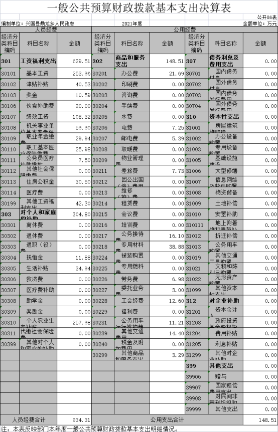 鼎龍鄉人民政府基本支出主要用于保障機關的正常運轉、完成日常工作而發生的人員支出和公用支出,主要包括工資福利支出、商品和服務支出、對個人和家庭的補助等三項支出合計1082.82萬元。其中,工資福利支出629.51萬元、商品和服務支出148.51萬元、對個人和家庭的補助支出304.8萬元。