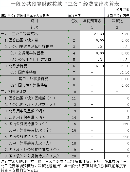 9.“三公”經費支出:指用一般公共預算財政撥款安排的因公出國(境)費、公務用車購置及運行維護費和公務接待費。其中,因公出國(境)費反映單位公務出國(境)的國際旅費、國外城市間交通費、住宿費、伙食費、培訓費、公雜費等支出;公務用車購置及運行維護費反映單位公務用車車輛購置支出(含車輛購置稅、牌照費),按規定保留的公務用車燃料費、維修費、過橋過路費、保險費、安全獎勵費用等支出;公務接待費反映單位按規定開支的各類公務接待(含外賓接待)支出。