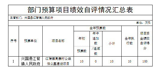 我部門今年在部門決算中反映“江背鎮(zhèn)高寨村公益性公墓建設(shè)項(xiàng)目”“江背綜合文化站免費(fèi)開放項(xiàng)目”項(xiàng)目績效自評結(jié)果。