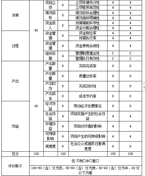 (4)績效評價結(jié)果采取評分和評級相結(jié)合的方式,具體分值和等級可根據(jù)不同評價內(nèi)容設(shè)定。總分設(shè)置為100分,等級一般劃分為4檔:100-90(含)分為優(yōu)、90-80(含)分為良、80-60(含)分為中、60分以下為差。