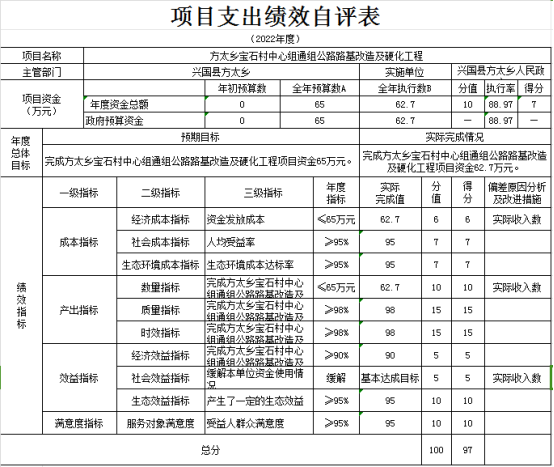 根據年初設定的項目自評方案,此項目支出績效設執行率10分。產出指標38分(分別為數量指標10分、質量指標9分、時效指標9分、成本指標10分)、效益指標40分(社會效益指標20分、可持續指標20分)、滿意度指標10分(服務對象滿意度指標),合計98分。
