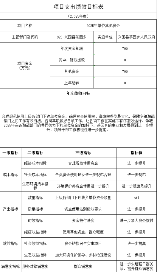 7.年度績效目標:合理規范使用上級各部門下達單位資金,確保資金使用率、準確率得到最大化,保障鄉鎮職能部門之間工作有效銜接,各司其職做好各項工作,讓各項工作在實施下有序高效運行。爭取2025年在各職能部門的共同努力下和單位資金的加持下,茶園鄉的事業和發展得到進一步提升,領導干部工作積極性進一步提高。